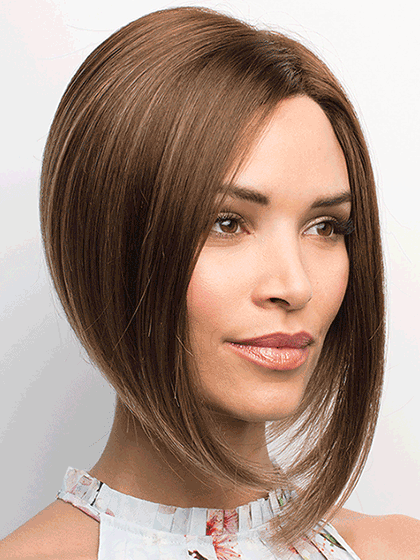 Dramatic a-line bob with a long fringe and tapered nape. Top hair ventilation with extended lace and soft-airy net Wefts sewn onto soft light breathable material.