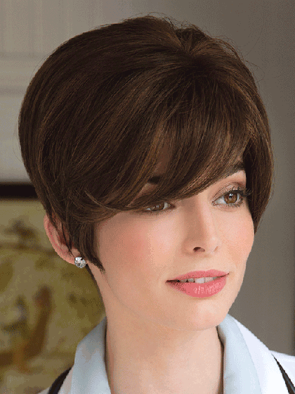 Flattering tapered style with a long asymmetric fringe.
