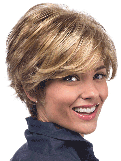 Avery radiates charisma with her beautiful wispy layers and flared back. Her long side swept bangs complete her bold yet classic look. This style is the perfect blend of beauty and comfort.