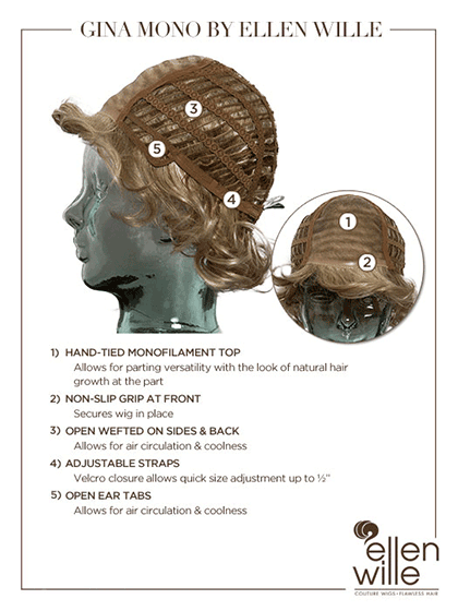 Gina Mono by Ellen Wille is a full layered and curly synthetic wig that's superbly styled and ready-to-wear. The full monofilament top is sheer and hand-tied to give you a natural scalp appearance with real hair movement. The open wefted cap is designed to allow the air to flow and keeps your wig light and cool all day. This synthetic wig is cut and styled to create full softly curled layers. To further personalize have your stylist trim and thin the bang.