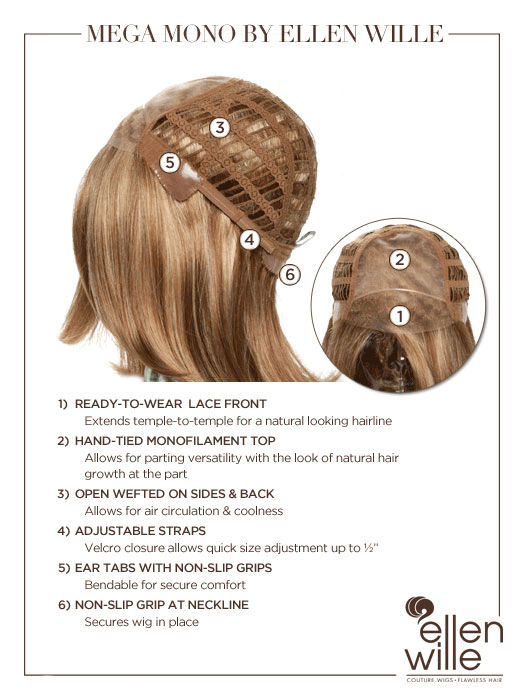 Mega Mono by Ellen Wille is a long and layered style. It has longer fringe and is strikingly natural-looking. This sleek long wig features a lace front and monofilament top and is ideal for an average head size. The density of the ready-to-wear synthetic hair looks more like natural hair and requires little to no customization or thinning. Mega Mono is part of the Ellen Wille Hair Power collection.