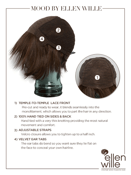 Mood by Ellen Wille is a treasured chin length bob crafted to give you an absolute natural look. The Mood is created with Ellen Wille's new and innovative Prime Hair! Prime hair is a proprietary composition of Human Hair enhanced with Premium Synthetic fiber which allows for longer lasting vibrancy of the colors. Prime hair is also stylable and due to the premium synthetic fiber (which withstands heat up to 350) any style you give these wigs will hold much longer and even through washings! This is workmanship at its finest creating the perfect wig wearing experience. Featuring a very thin hand-knotting the Mood provides a new innovative lace front that seamlessly blends into the front part replacing the well known monofilament. The soft and caressing hair provides a great sense of well-being and is unmatched with its versatility in styling. The cap is adjustable and lightweight providing comfort with a custom fit. Mood is part of the Ellen Wille Prime Power collection.
