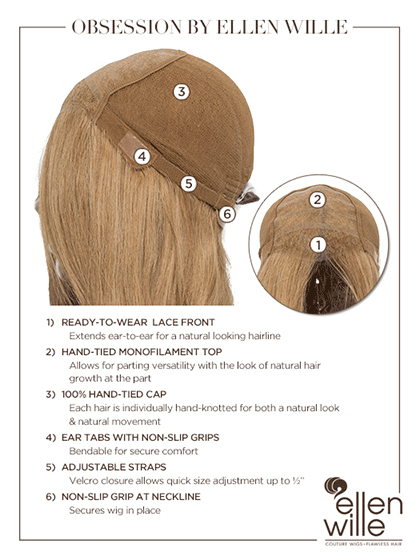 Obsession by Ellen Wille is a long and luxurious human hair wig that's hand-made and perfected in every way. The 100% Remy Human Hair is processed to keep the integrity and shine. The delicate lace front is ready-to-wear out of the box and looks incredibly natural. The monofilament top provides the look of your own hair growth creates natural volume and can be parted on either side or down the center. With an overall length of 24?? you change your hairstyle and create any look.