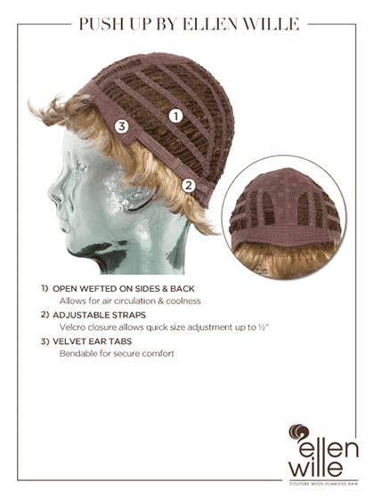 Push Up by Ellen Wille is fun flirty and hand finished to give you effortless style with a comfortable fit. The open wefted cap is designed to allow air to flow through keeping your wig light and cool all day. This synthetic wig is expertly cut to bring out the most of the style and color selection. The open wefts provide comfort during any season and are constructed to provide full coverage. The ear tabs and neckline are lined with velvet for added comfort and keep it secure. You can adjust the cap size up to half an inch using the smooth Velcro straps. The synthetic hair is pre-styled ready-to-wear and maintains it'shape after washing.