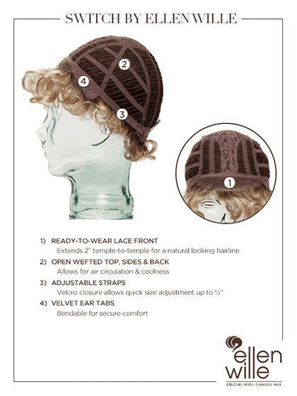 Switch by Ellen Wille is a short curly and voluminous wig. It's a modern twist on a classic curl. The ringlet curls can be worn polished and tight or can be combed out to loosen the curl. This wig features a lace front and is ideal for a petite to average head size. The density of the ready-to-wear synthetic hair looks more like natural hair and requires little to no customization or thinning. Switch is part of the Ellen Wille Perucci collection.
