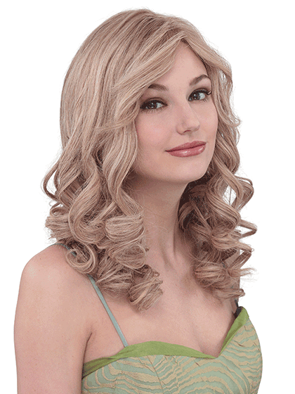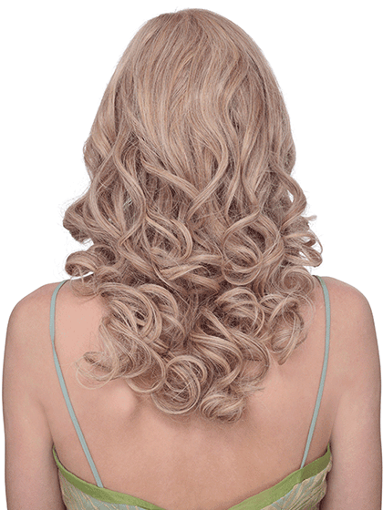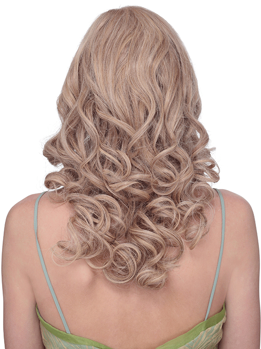 This long non-permanent curly style is relaxed at the crown with feminine and fabulous curls toward the bottom. Wear down and casual during the day and swept up into a glamour hairdo for evening fun. Our human hair is of premium quality and our impeccable lace front construction offers a natural appearing hairline and off the face flexibility. No Bang.