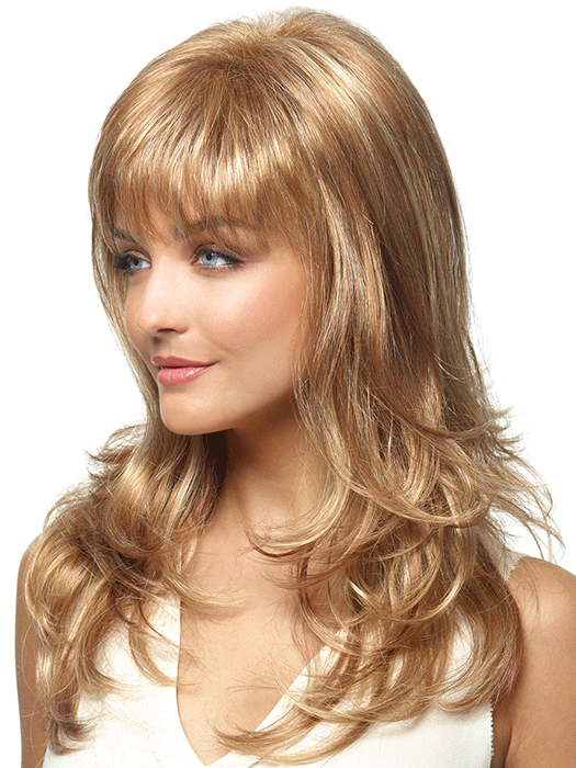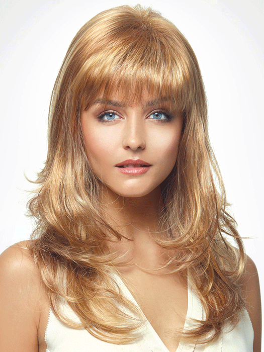 Long layers of loose curl with full bang