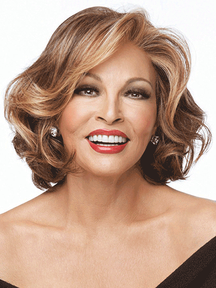 Including dramatic side swept bangs and long subtle layering throughout this stunning mid length cut combines the natural looking hairline of a lace front monofilament part for off the face styling and parting flexibility with the added styling versatility of heat friendly synthetic hair.