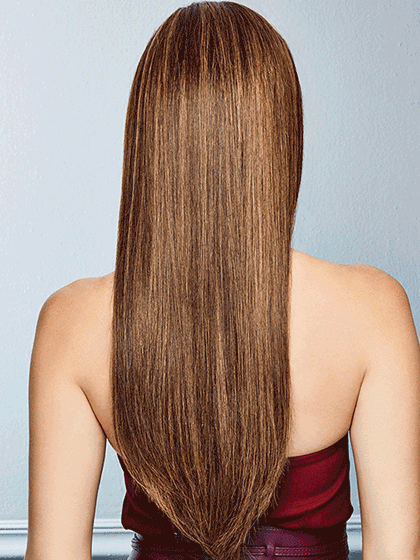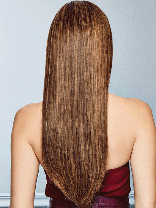 Our longest style ever. The effect of a one length look is expertly achieved with subtle layering and softly textured ends for gentle movement even at this extreme length. Whether waved or slick straight 100% Remy human hair means tangling is minimal and the French Drawn lace front monofilament top lets you part and style any way you like.