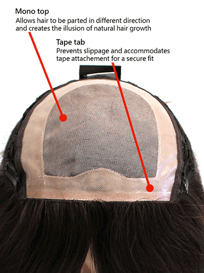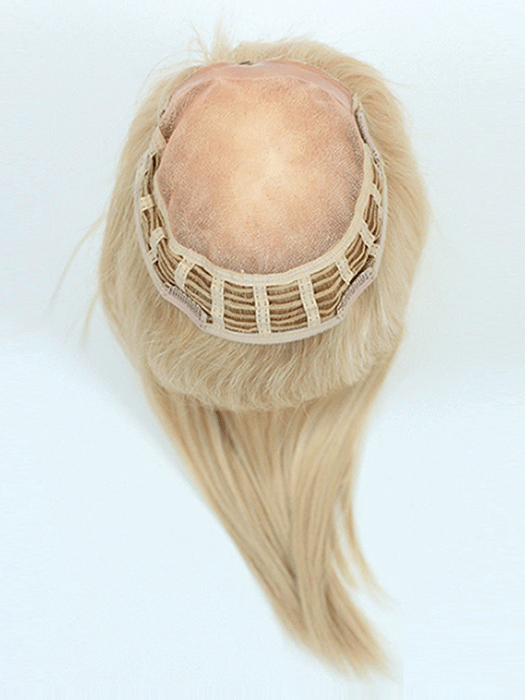 Demi Topper Monofilament Top Human Hair Hairpiece by Wig Pro features a monofilament top and the sides and back are machine wefted. This topper is made with Optimum Cuticle Hair. The monofilament top creates a realistic scalp appearnce and allows you to change the parting in any direction. This is perfect to address any thinning areas around the top and crown. A tape tab plus four pressure sensitive clips add an additional layer of security so your look will last all day.