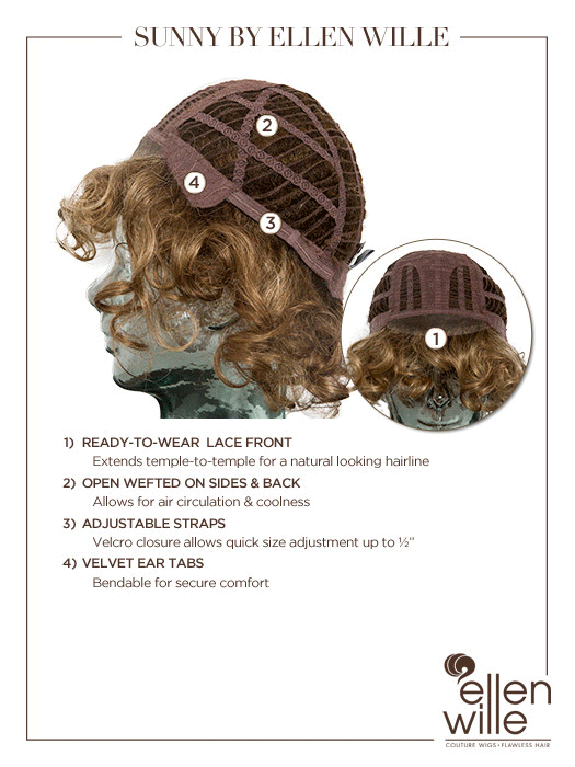 Sunny by Ellen Wille is a fun flirty and super curly synthetic wig. The temple-to-temple lace front is ready-to-wear and gives you a natural hairline. The open wefted cap is designed to allow air to flow through keeping your wig light and cool all day. This synthetic wig is expertly cut to bring out the most of the style and curl pattern. To smooth and re-shape the curl simply twist with your fingers.