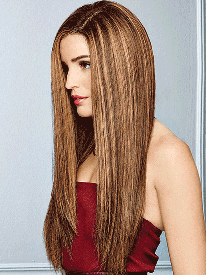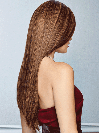 Our longest style ever. The effect of a one length look is expertly achieved with subtle layering and softly textured ends for gentle movement even at this extreme length. Whether waved or slick straight 100% Remy human hair means tangling is minimal and the French Drawn lace front monofilament top lets you part and style any way you like.
